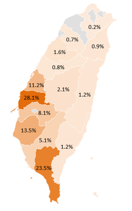 Jak pokazano na ryc. 2, na Tajwanie snajduje się sześć głównych hrabstw produkujących wieprzowinę. Yunlin (środkowy zachód wyspy) i Pingtung (południowy zachód) posiadają ponad 50% całkowitej populacji loch. Pozostałe cztery obszary to Tainan (13.5%), Changhua (11.2%), Chiayi (8.1%) i Kaohsiung (5.1%). Jeśli chodzi o populację świń, największe gospodarstwa (5 000 sztuk lub więcej) stanowią tylko 2% całkowitej ich liczby, ale hodują 22% świń. Należy również zauważyć, że nadal istnieje wielu małych graczy: gospodarstwa posiadające mniej niż 100 sztuk stanowią 24% ogółu, ale produkują mniej niż 1% mięsa wieprzowego w kraju. Jednak ankieta przeprowadzona na początku 2023 r. wskazuje, że 15% właścicieli tych małych gospodarstw planuje zmniejszyć lub zaprzestać produkcji.
