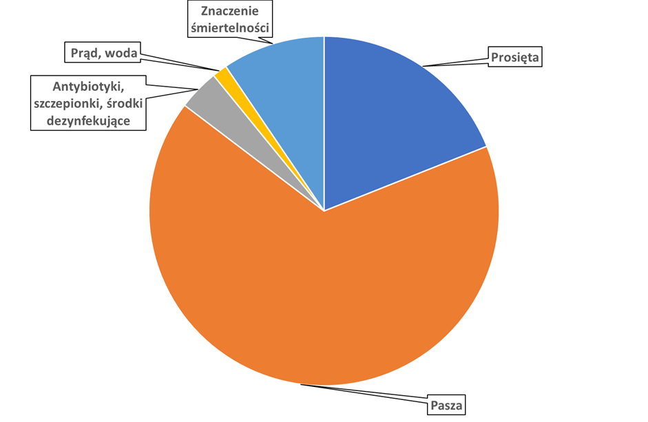 Jak pokazano na ryc. 2, prawie 70% kosztów produkcji świni gotowej do uboju stanowi pasza. Całkowity koszt wynosi około 48.000 VND za kg (1,9 € za kg). Duże firmy mają dodatkowe koszty (weterynarze, sprzedaż i marketing...), a ich "opłata za zarządzanie" zwiększa koszty o około 10%.