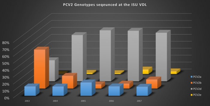 Recientemente, Rovira del VDL, University of Minnesota, condujo un estudio de distribución de genotipos de PCV2 de muestras clínicas recolectadas durante 2017-2018. Se secuenciaron 100 muestras positivas de PCV2 de 2017 y 100 de 2018. A partir de 2017 la distribución fue la siguiente: 35% PCV2a, 12% PCV2b, 50% PCV2d y 3% PCV2e. Mientras que a partir de 2018 fue 35% PCV2a, 6% PCV2b, 57% PCV2d y 2% PCV2e. Entonces el PCV2d es el genotipo principal, pero PCV2a y PCV2b no han desaparecido; ellos aún están allí y pueden causar PCVAD. (A. Rovira et al., 2020)