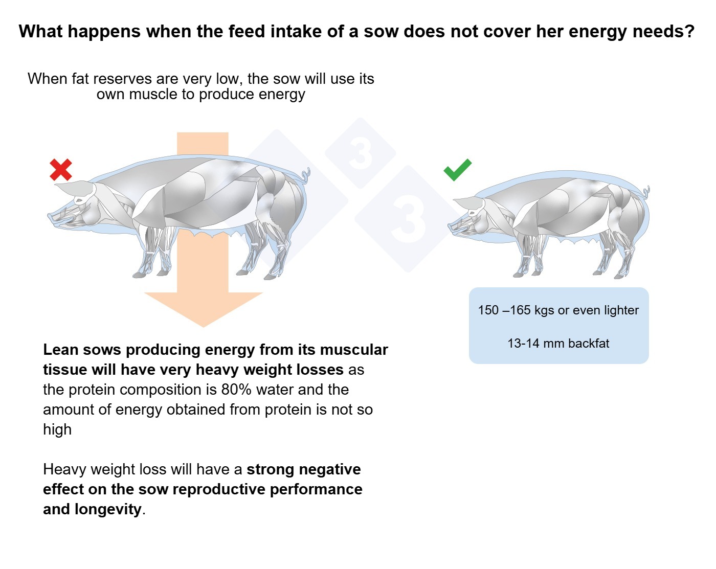 DanBred animals are also breeding animals, so feed composition and feeding strategy must be adapted to ensure that both sows and boars have the right body condition for a long lifetime performance with many piglets born and weaned. If this is not taken into account, the breeding animals will become too large and lean, which affects both productivity and longevity.