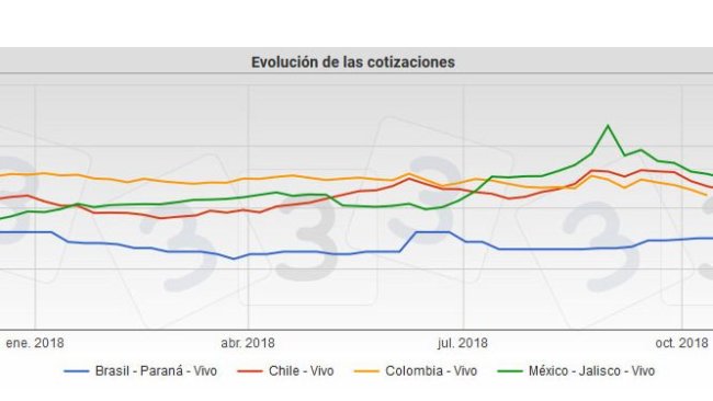 En cuanto al precio pagado al productor, el 2018 fue atípico, pues la curva de bajada de las cotizaciónes, que comunmente llegaba hasta julio o agosto, se extendió hasta finales de septiembre (gráfica 2), generando una preocupación en los productores y una reducción de las ganancias acumuladas en el año. De acuerdo a los precios ponderados a nivel nacional, el promedio anual en el 2018 fue de $4.885/kg vivo, registrando una disminución de un 8,1% frente a la media de 2017 que fue $5.317/kg vivo.