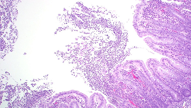 Figura 2. El examen histopatológico de los animales afectados reveló una colitis ulcerativa fibrinopurulenta multifocal o localmente extensa.