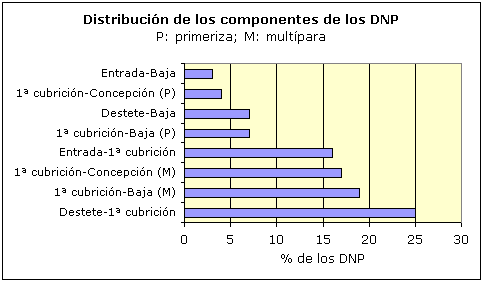 Los intervalos que van a influir más en el total de DNP son el intervalo alta-cubrición de las primerizas, el intervalo destete-cubrición, el intervalo destete-sacrificio y el intervalo cubrición-repetición. En menor proporción los intervalos de entrada de primerizas a muerte, cubrición a fallo en partos y cubrición a sacrificio. (Gráfico 1)