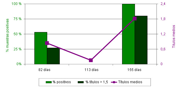 En la figura 3 se muestra la evolución de los títulos serológicos en lechones (medidos con ELISA para influenza) nacidos del primer lote de hembras vacunadas con la vacuna trivalente de influenza. No se detectó más circulación de influenza en estos lechones.