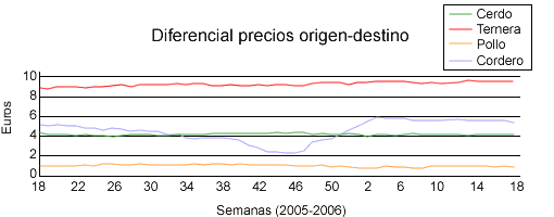 El MAPA publica semanalmente en su web, el diferencial de precios entre origen y destino para diferentes productos alimentarios. Hemos comparado los diferenciales de las cuatro carnes principales (cerdo, ternera, pollo y cordero) a lo largo de un año (semana 18 de 2005-semana 18 de 2006) y las hemos comparado.