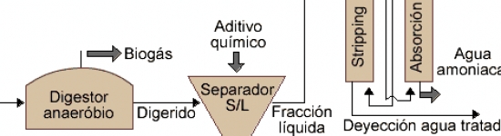 | Figura 2. Representación esquemática diagrama de flujo del tratamiento combinado de la digestión anaerobia y la recuperación de N mediante stripping de amonio (Campos, 2004). |