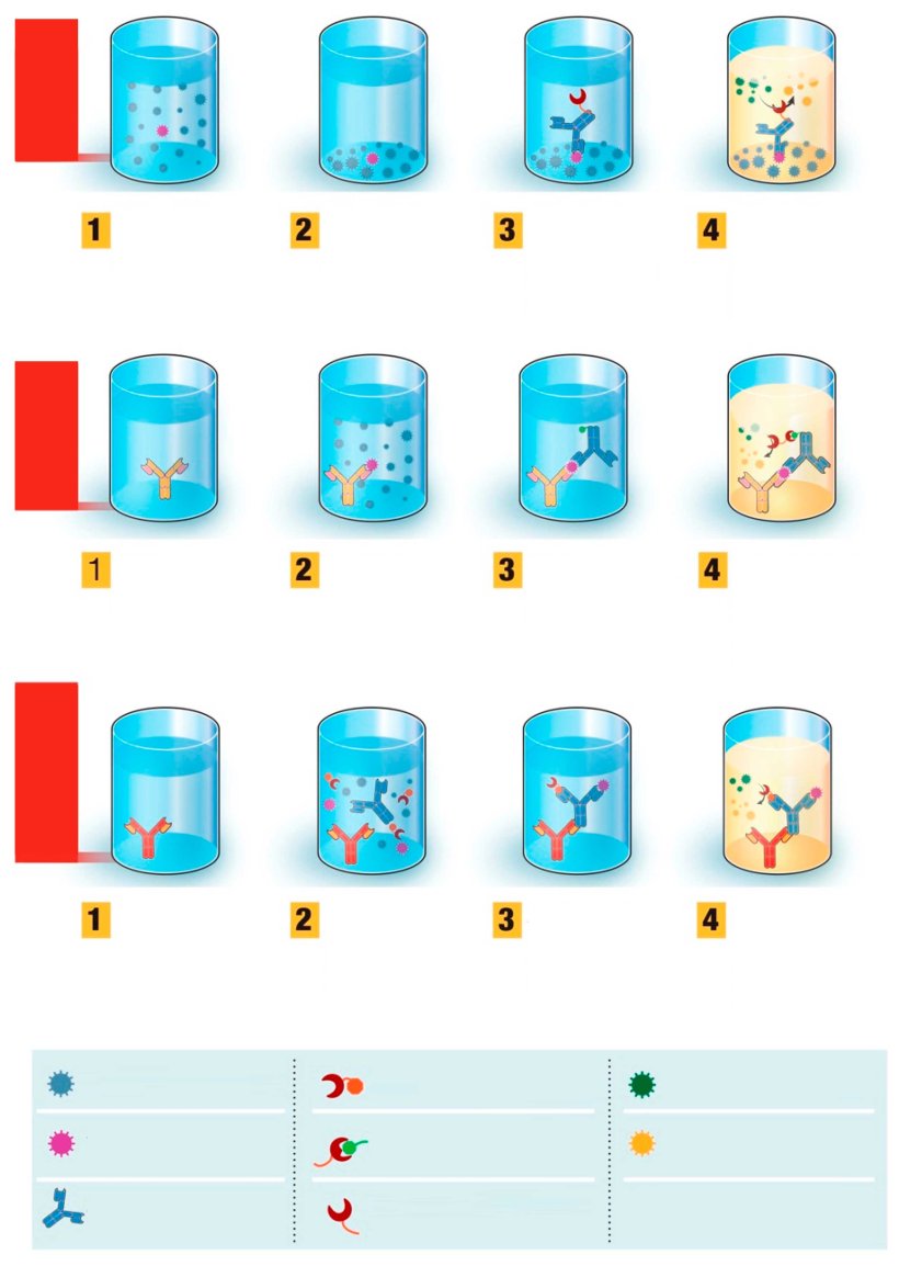 - Paso 3. Se retira la muestra y se añaden los anticuerpos especiales que se adherirán al lado opuesto de los anticuerpos (parte inferior de la “Y” del anticuerpo en la detección de anticuerpos) o de los antígenos (parte superior de la “Y” en la detección de antígenos). Entonces se incuba la muestra para permitir la unión y se lava para asegurarnos de que se eliminan los anticuerpos o antígenos que no se hayan adherido (es decir, los no objetivo).