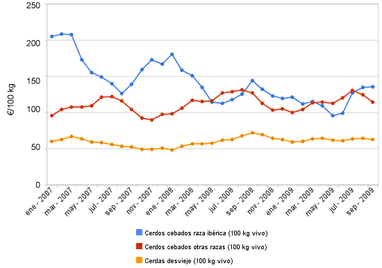 Presentamos en una gráfica la evolución de los precios percibidos por los ganaderos de porcino entre enero de 2007 y septiembre de 2009 según el MAPA. En ella se puede observar claramente el retroceso que ha sufrido el sector del cerdo ibérico.