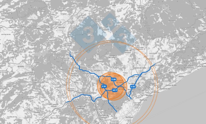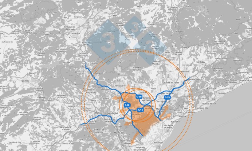 Zona core, en naranja, delimitada por las las autopistas AP7, C58 y C16. Los círculos indican la zona de 6 y de 20km.