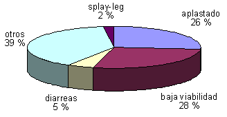 Una vez comentado este punto, pasamos a analizar las causas de mortalidad a partir de la base de datos de PigCHAMP durante el año 2006. En el gráfico 1 se muestra la distribución por causas de las bajas de lechones lactantes durante el año 2006