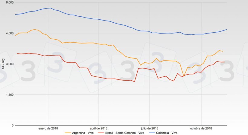 En comentarios anteriores, mencionamos que Colombia no estaba pasando por un buen momento en su mercado. En el último informe económico del área económica de PorkColombia, mencionan que los precios de fin de año tienden al alza. Esto se puede contrastar con la evolución de las cotizaciones de las últimas semanas del tablero de cotizaciones de 3tres3, aunque se puede apreciar que la subida de los precios se ha retrasado.