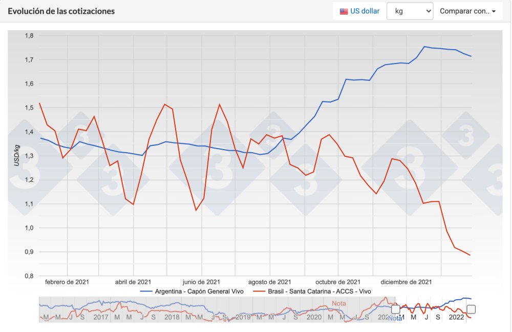 Tal como se puede observar en la imagen la carne de cerdo argentina se ve desfavorecida en el comercio internacional, al ubicar su precio por kilogramo por encima de 1,7 USD, mientras que por ejemplo en Brasil los precios internacionales por kilogramo de carne están en aproximadamente en 0,89 USD.