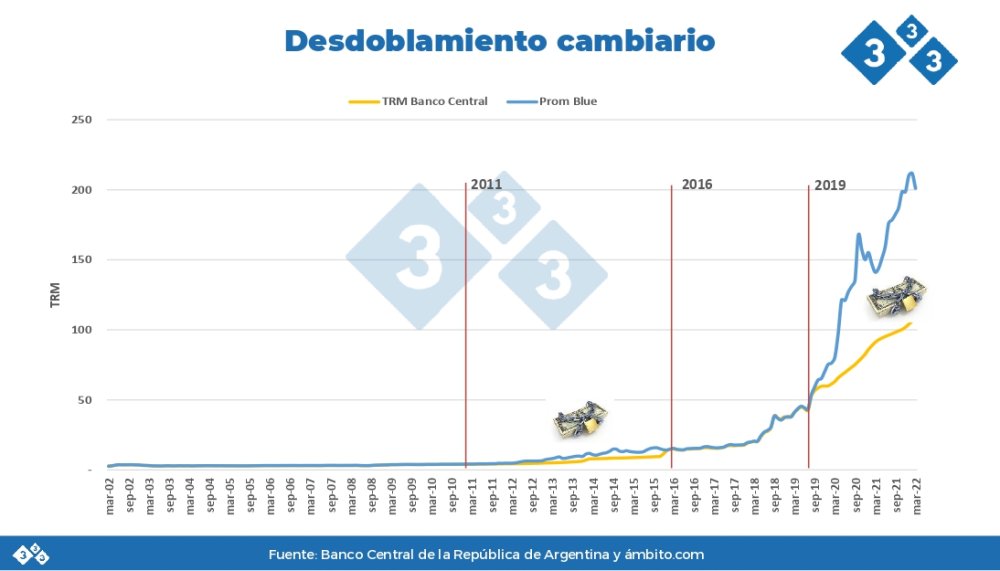 Como resultado de la implementación de este esquema de control de cambios, los argentinos se volcaron al sector informal para adquirir dólares, dando lugar al desdoblamiento cambiario (Gráfico 1), del cual surgió lo que se conoce hoy en día como dólar blue (dólar negro o ilegal), que, debido a la alta demanda, rápidamente empezó a apreciarse. Desde entonces, los argentinos se han acostumbrado a convivir con diferentes cotizaciones de la moneda estadounidense.