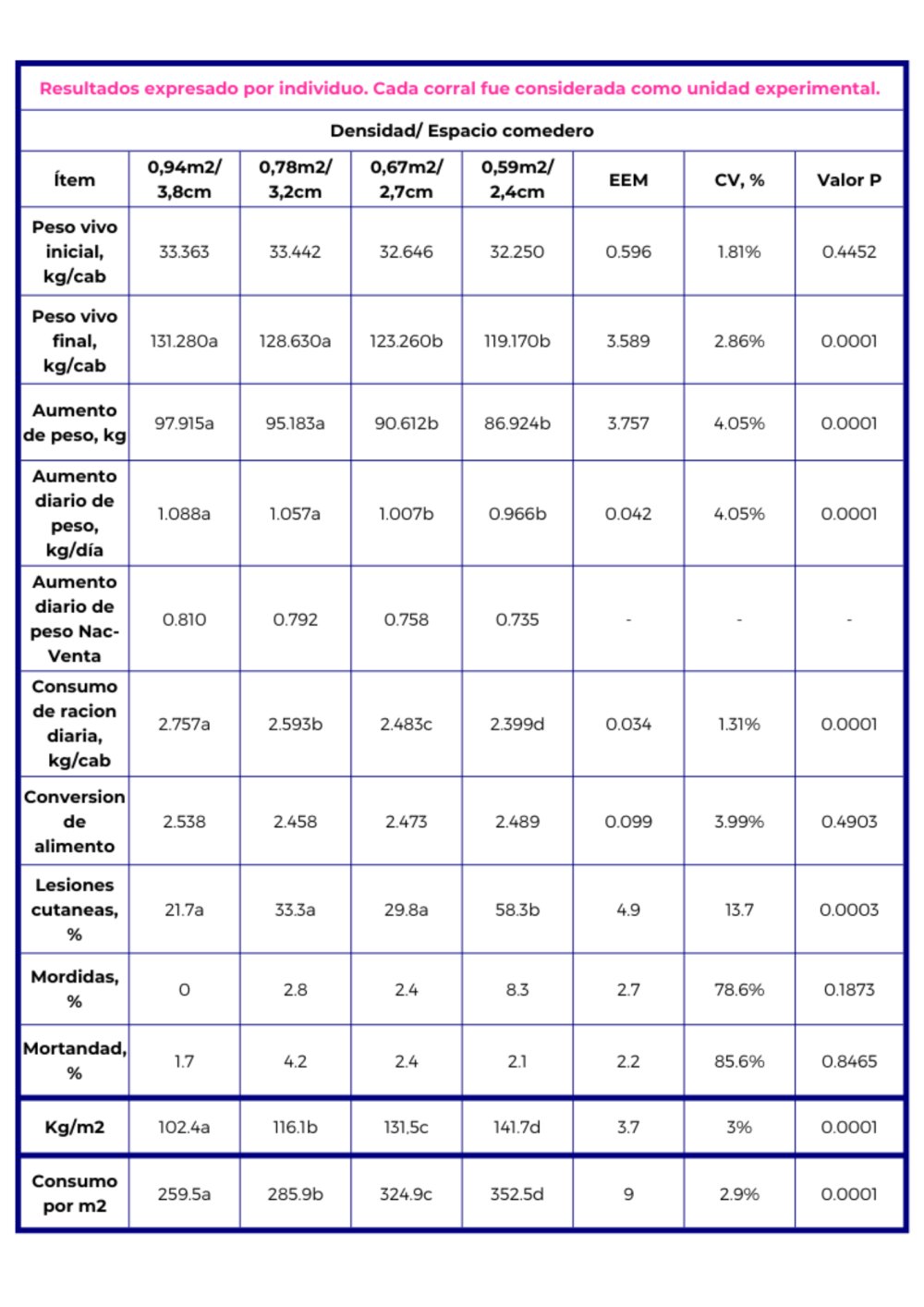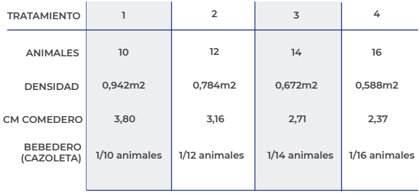 Los resultados obtenidos por este estudio confirman que hay un impacto en el desempeño de los animales de acuerdo a la densidad a la que se encuentren y según la disponibilidad de espacio y centímetros de lineales de comedero.