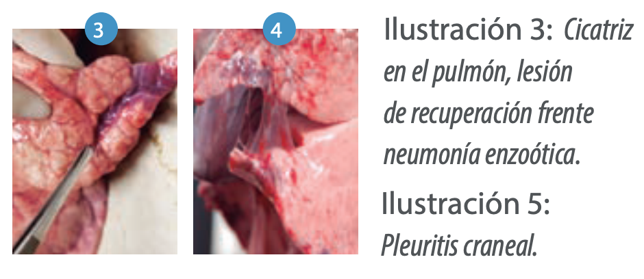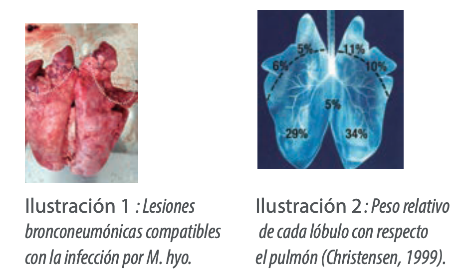 Las lesiones habitualmente valoradas en el frigorífico son las bronconeumonías compatibles con Mycoplasma hyopneumoniae y las pleuritis asociadas a Actinobacillus pleuropnumonia y a patógenos secundarios. Existen numerosos sistemas de valoración de lesiones pulmonares (García-Morante et al., 2012) con cuatro características que deberían cumplir.