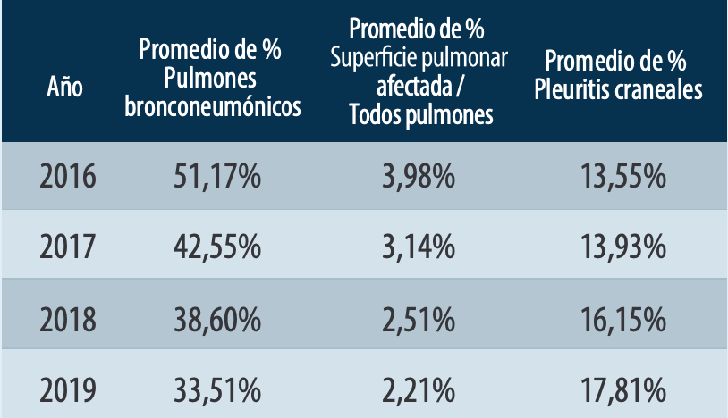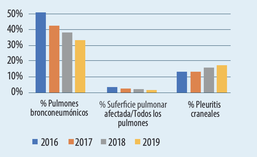 El promedio de los años 2018-2019 muestra que en general hay una prevalencia moderada de lesiones compatibles con M.hyo con una superficie pulmonar afectada leve y una afectación moderada de lesiones compatibles con App crónico.