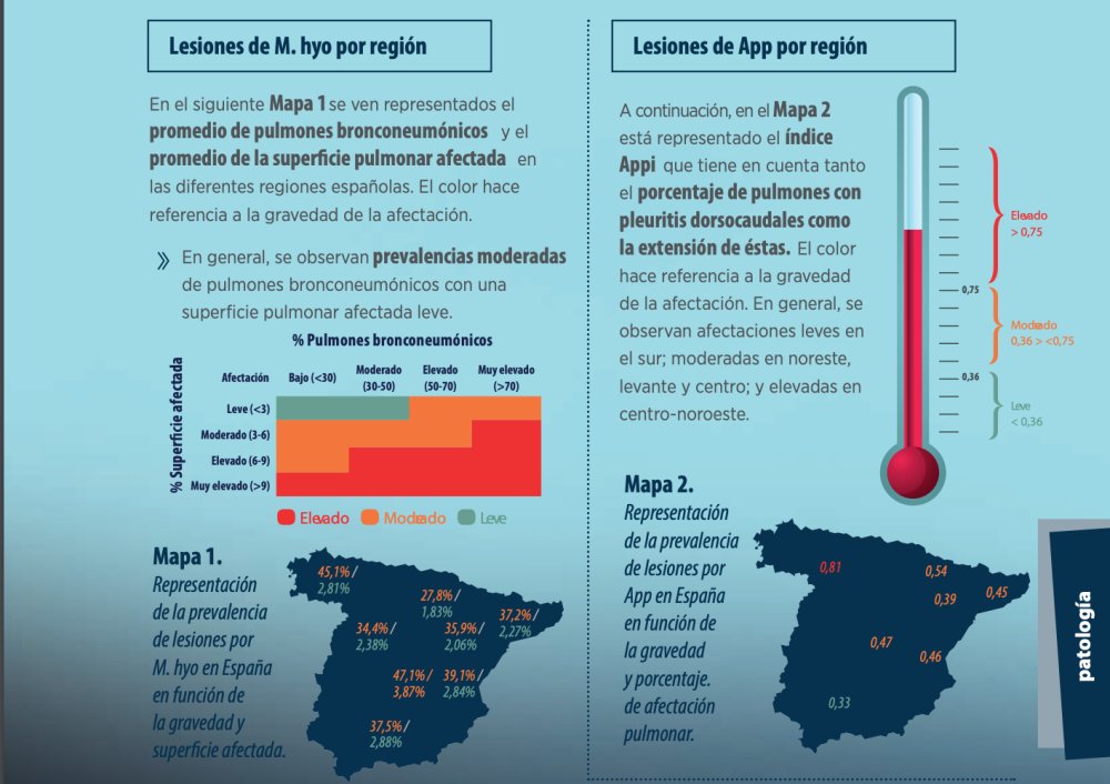 Para este estudio se han incluido un total de 1.723 lotes y 268.827 pulmones de diferentes explotaciones españolas valorados con el sistema CLP entre los años 2018 y 2019. Para cada lote se calcularon los siguientes parámetros relacionados con Mycoplasma hyopneumoniae: