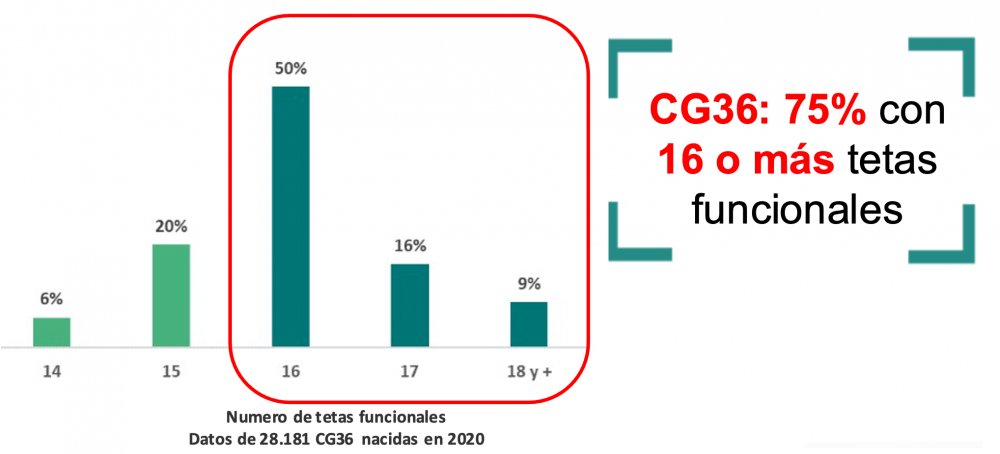- Menor necesidad de trabajo: una alta prolificidad asociada a un número insuficiente de tetas generará una mayor demanda de servicio, principalmente para estandarizar el exceso de lechones, con un gran porcentaje de “nodrizas”. En granjas con alta productividad con CG36 (+14 lechones destetados por cerda) tienen un promedio de 5 a 7% de nodrizas, mientras que en otras líneas genéticas con la misma productividad la necesidad de nodrizas es de 20 a 25%.