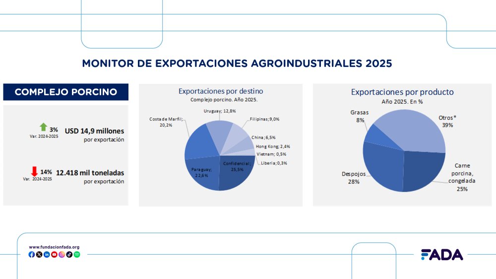 En el caso particular de la carne porcina, cerró el 2025 con exportaciones por MUSD 15, un 3 % más que en 2024. La carne porcina congelada explicó el 25 % de estas exportaciones, el resto corresponde a productos como tocino, jamones, paletas y más (39 %), despojos (28 %) y grasas (8 %).