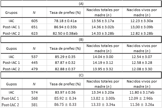 Tabla 1: Parámetros reproductivos obtenidos de cerdas con 2-3 (A),4-5 (B) y mayor o igual a 6 (C) partos inseminadas con cervical: 3 mil millones espermatozoides, postcervical 1: 1,5 mil millones espermatozoides y postcervical 2: mil millon espermatozoides)