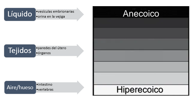 Dependiendo de la amplitud de la onda que se recibe en el transductor, la imagen ecográfica se va formando con distinta tonalidad según una escala de grises (Borrego y Cortez, 2018), donde: