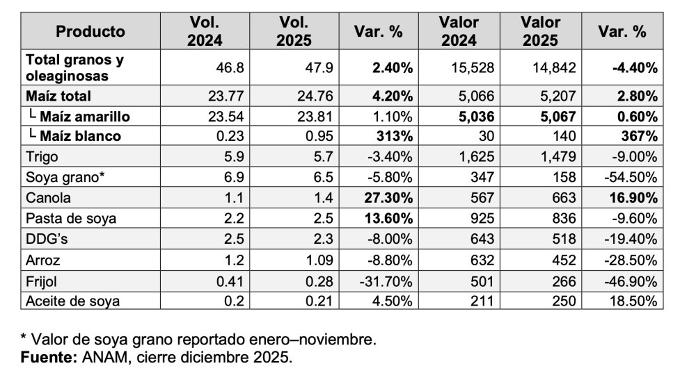 - Canola y pasta de soya registran incrementos relevantes en volumen, asociados a la demanda de aceites y alimentos balanceados. La caída en frijol soya se compensa con mayor importación de canola.