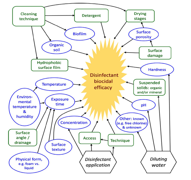 Existen numerosos factores que interfieren en la acción biocida de un desinfectante en situaciones reales de campo. Según un estudio de 2021, algunos de estos factores se pueden simular en pruebas de laboratorio controladas, como el tiempo de exposición, la dilución, algunas características relacionadas con la calidad del agua y la materia orgánica. Sin embargo, hay otros coeficientes adicionales que entran en esta ecuación y que se encuentran solo a nivel de campo, como la técnica de aplicación, el tipo de superficie a desinfectar, la acción de residuos de detergentes u otros desinfectantes y la presencia de biopelículas.