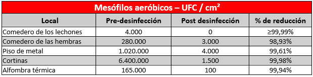 - El desinfectante Virkon® LSP logró una tasa de reducción promedio de 99.69% para el recuento de mesófilos aeróbicos;