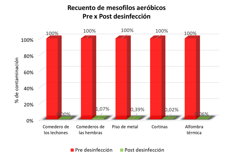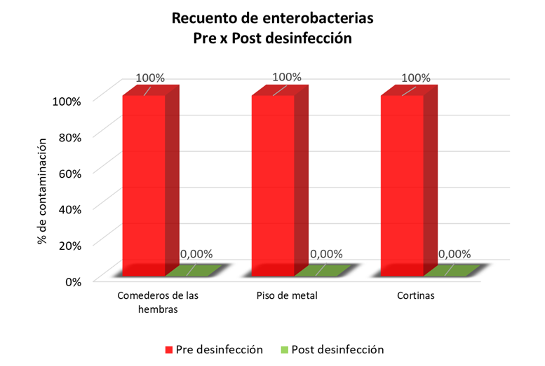 La sala de maternidad donde se realizó el estudio tenía 504 m² y 60 celdas parideras. Los hisopos fueron recolectados estériles y por la misma persona en 5 estructuras diferentes, con 2 réplicas por sitio, totalizando 20 muestras: 10 pre y 10 post desinfección. Los lugares evaluados fueron: Comedero de los lechones, Comedero de las cerdas, Piso de metal, Cortina y Alfombra térmica.
