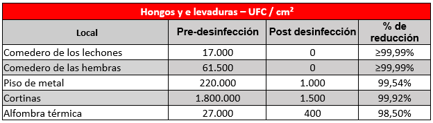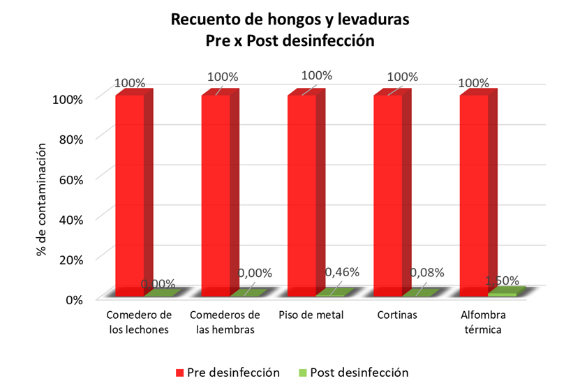 En base a los resultados obtenidos en campo en este estudio, independientemente de los factores que interfieren en la acción biocida de un desinfectante en situaciones reales de granja, como la calidad del agua, la temperatura ambiente, la técnica involucrada en la aplicación, el tipo de superficie o material, el desinfectante Virkon® LSP, el fenólico sintético de Lanxess Biosecurity Solutions, fue capaz de lograr altas tasas de reducción en los análisis de recuento bacteriano y fúngico, demostrando un excelente rendimiento en condiciones reales de campo y actuando como un fuerte aliado del productor en la lucha contra patógenos de interés para la porcicultura.