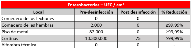 Los resultados de los análisis de laboratorio, expresados en unidades formadoras de colonias por centímetro cuadrado (UFC/cm2) antes y después de la desinfección, indican que: