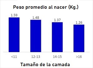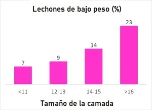 Los lechones de bajo peso al nacer son una realidad en las granjas de todo el mundo. Esto se debe, entre otros factores, a una menor capacidad uterina de las matrices de cerdas en soportar el crecimiento fetal de manera uniforme. Así, cuanto más grande la camada, menor el peso promedio de los lechones y mayor proporción de lechones considerados de bajo peso, como se puede observar en los gráficos que siguen abajo. En ese sentido, diversas líneas de investigación buscan, a través de la nutrición, disminuir ese problema para que las hembras produzcan camadas más uniformes y de mayor peso al nacer.