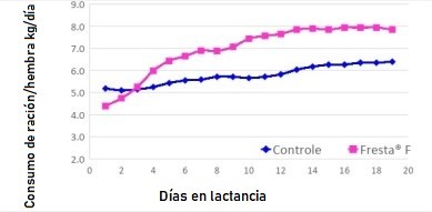 Además de los procesos de aporte de nutrientes y oxígeno, otros puntos que sirven de base para estrategias nutricionales que ayudan al desarrollo de los fetos son la partición de energía y el metabolismo de insulina. En ese sentido, el cromo y la L-carnitina, un aminoácido no proteico, pueden ayudar en el metabolismo energético y la tasa de ovulación. Otro problema común, fundamentalmente en hembras por encima de la condición corporal ideal es la resistencia a la insulina, que de manera general perjudica el metabolismo energético. En la etapa de gestación también pueden utilizarse algunos fitogénicos que pueden tener efectos positivos sobre la digestibilidad de los nutrientes y sobre la resistencia a la insulina, lo que redunda positivamente en el consumo de ración diaria en la lactancia, como muestra el gráfico abajo.