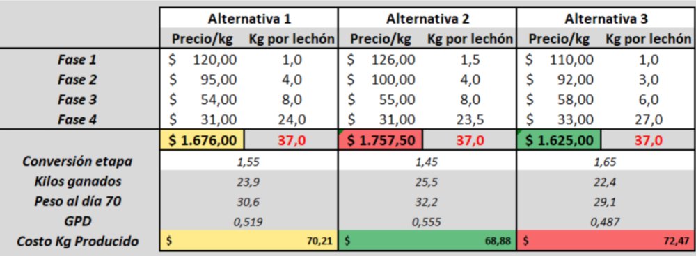 De manera esquemática y gráfica, observamos que lo que parecía un presupuesto más costoso (alternativa 2), resaltado en rojo el costo total de la recría, en la práctica luego de su desempeño productivo, termina siendo la alternativa más económica en “costo por Kg Producido”.