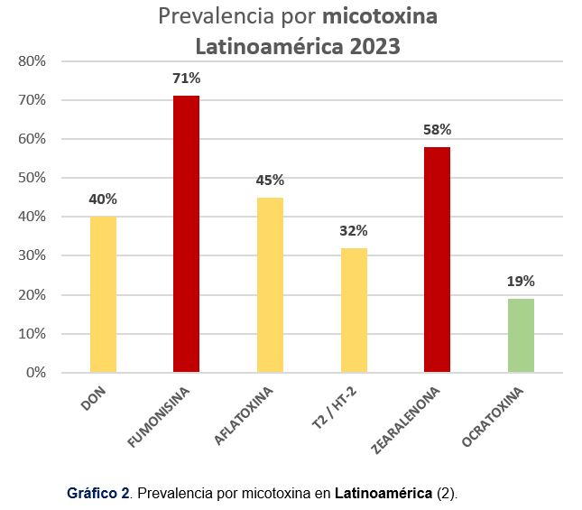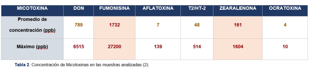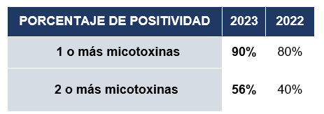 En el año 2023, relevamientos de casi 8000 muestras de granos y alimentos balanceados en varias regiones de Latinoamérica reveló resultados alarmantes2.