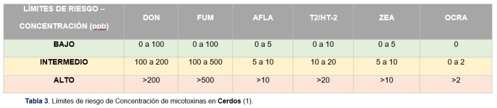 En Argentina, la Fumonisina fue la micotoxina más prevalente, presente en el 82% de las muestras, con concentraciones promedio de 2095 ppb., lo que supera ampliamente los límites de riesgo recomendados para los cerdos, que son de hasta 100 ppb en las etapas iniciales y de crecimiento, y hasta 500 ppb en las etapas de engorde y reproducción2. (ver tabla 3)