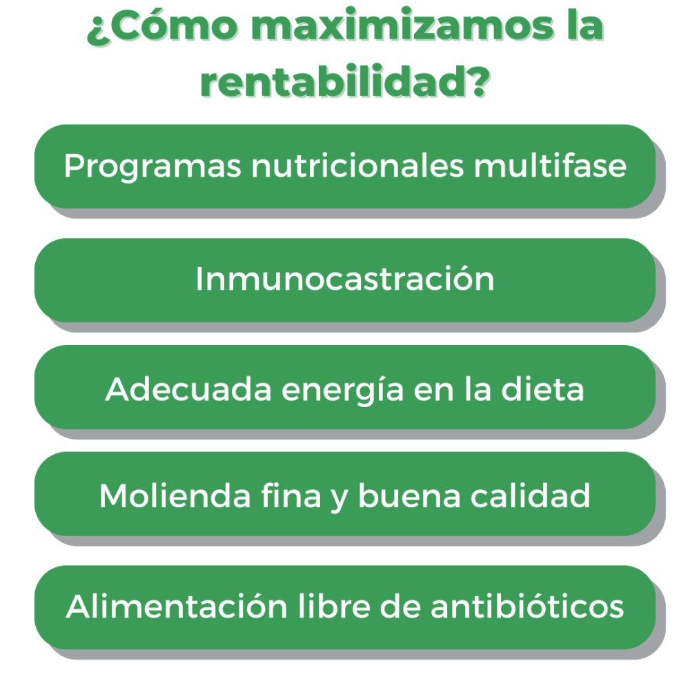 Algunas de las herramientas para maximizar la rentabilidad es la elaboración de programas nutricionales multifase, dietas diferenciadas por sexos, inmunocastración, formulación de dietas con niveles de energía adecuada, molienda fina y materias primas de calidad, siendo en Argentina a base de maíz y soja pudiendo incorporar otros cereales como cebada, trigo o sorgo.