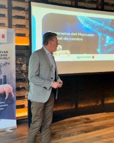 La apertura de las presentaciones estuvo a cargo de Alexandre Furtado da Rosa, director superintendente de Agroceres PIC, quien presentó un completo panorama del mercado global de cerdo. Analizó las tendencias que están marcando el ritmo de la producción mundial, la dinámica del comercio internacional y los desafíos competitivos para los sistemas productivos de la región.