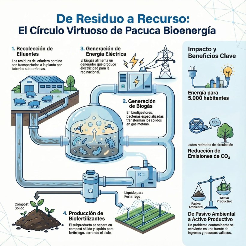 Pacuca integra producción porcina, manejo de efluentes y generación de energía renovable. Con una inversión de casi 6 millones de dólares, la planta produce más de 8000 MWh al año, suficiente para abastecer de electricidad —las 24 horas del día— a unas 5000 personas. La energía limpia se inyecta directamente al sistema interconectado nacional.