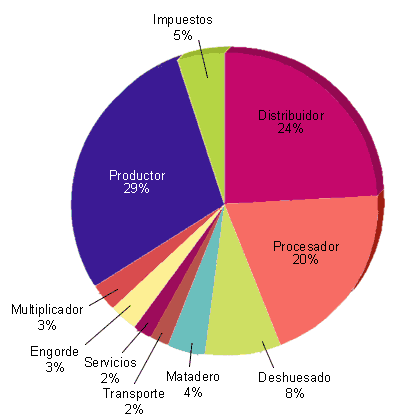 Se ha introducido la figura del “euro del consumidor”, que divide los costes en toda la cadena. La mayoría de los costes pueden atribuirse a la industria primaria (alimentación, IA, tratamiento de purines, veterinario, energía...). De hecho, el 36% del “euro del consumidor” se paga directamente al ganadero, de los que sólo el 6% son de beneficios por su trabajo. El minorista obtiene el 24% del “euro”, el procesador el 20%, el deshuesado el 8% y el matadero el 4%.