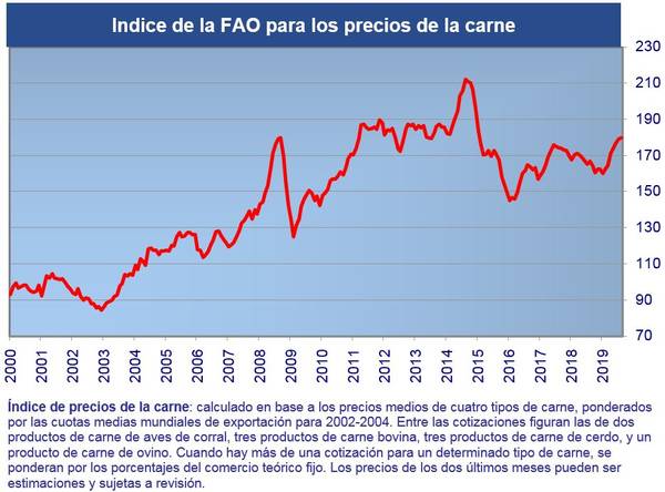 El índice de precios de la carne de la FAO ascendió a un promedio de 179,8 puntos en agosto, es decir, un aumento del 0,5 % (casi 1 punto) respecto de su valor revisado de julio, con lo cual continúa la tendencia de alzas intermensuales moderadas de los precios que se registra desde febrero. Con el aumento más reciente, el valor del índice se sitúa, respectivamente, un 12,3 % y un 7,8 % por encima de los niveles de enero de 2019 y agosto del año pasado. En agosto, las cotizaciones de la carne de cerdo se fortalecieron aún más a causa de una fuerte demanda de importaciones en Asia, principalmente en China, donde la peste porcina africana siguió limitando la producción nacional de esta carne. A pesar de la fuerte demanda de importaciones, las cotizaciones de la carne de aves de corral y la carne de ovino se mantuvieron estables, debido a un aumento de las disponibilidades exportables en las principales regiones productoras. Si bien el comercio internacional de carne de bovino siguió siendo robusto, las cotizaciones expresadas en USD descendieron ligeramente, a causa del debilitamiento de las monedas nacionales de algunos de los mayores países exportadores, entre ellos Australia.