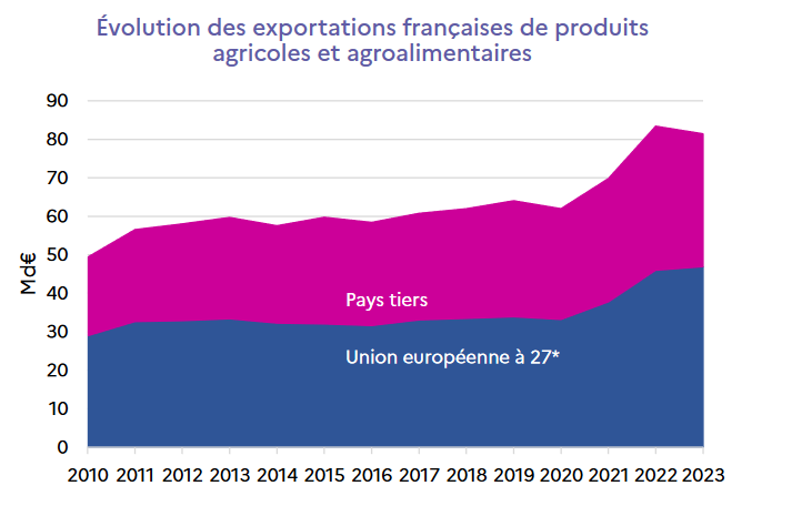 Desde 2020, Francia es el 6º exportador mundial de productos agrícolas y agroalimentarios, con una cuota de mercado estable en 2023, del 4,4 %.