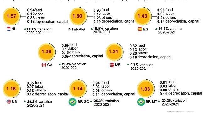 Embrapa Suínos e Aves divulgó tres gráficos con los resultados preliminares de los costos mundiales de producción porcina para 2021. Los números fueron presentados durante la reunión anual del Grupo de Comparación de Costos de Producción Porcina (InterPIG).