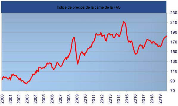 El índice de precios de la carne de la FAO registró un promedio de 182,7 puntos en octubre, o sea, un 0,9 % (1,7 puntos) más que en septiembre, lo que representa el noveno incremento mensual consecutivo.