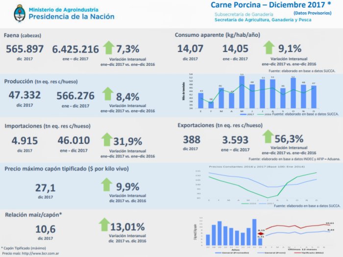 El sector porcino de Argentina ha tenido en los últimos años un crecimiento constante, que se tradujo en una producción de carne de cerdo que en el año 2017 alcanzó las 566 mil tn de carne, con más de 6 millones de cerdos faenados (Anuario 2017. Minagri). Estas cifras marcan un crecimiento con respecto a los valores que se obtenían al comienzo de la década del 90 de más del 350 %. Sin duda que el motor de este crecimiento lo constituyó el consumo de carne de cerdo que en la Argentina ha crecido de los 5 a 6 kg. históricos a más de 15 kg habitante año en la actualidad, constituyendo a la carne de cerdo como la 3° en la preferencia de los argentinos, con una participación del 14% del consumo total de carne habitante año en el país (Informe Asoc. Argentina de Productores Porcinos. 2018).