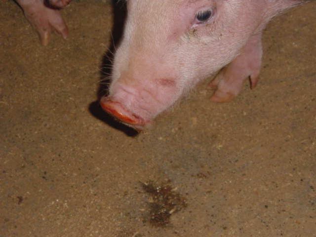 En ambos cebaderos nos encontramos con animales que presentaban una intensa dispnea, estaban muy delgados y con un aparente cuadro febril así como muertes súbitas y, en alguno de los animales, se observó un cuadro con síntomas de incoordinación. Las necropsias no nos sacaban de muchas dudas: pulmones aparentemente sanos, estomagos llenos, algo de fibrina en cavidad abdominal y poca cosa más.