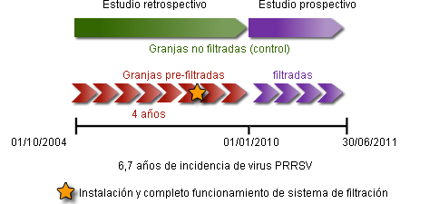 Todas las granjas fueron incluidas en el estudio en enero del 2010 y seguidas hasta el 30 de junio de 2011. Las granjas control (con un total de 58.900 cerdas) fueron seguidas desde octubre del 2004 hasta junio del 2011 (6,75 años). Las granjas filtradas (63.600 cerdas), en cambio, fueron seguidas desde 4 años antes de que instalaran el sistema de filtración y, una vez filtradas, hasta junio del 2011, con una media de 1,6 años por granja (rango 0,49 a 2,47 años) (gráfica 1).