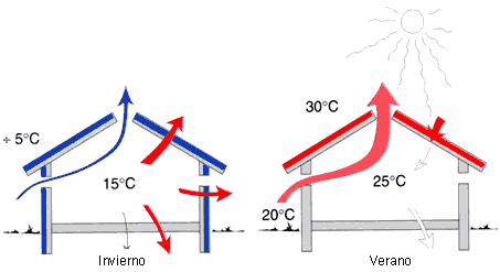 Figura 2. La ventilación de invierno (izquierda) controla el equilibrio de humedad, mientras que la ventilación de verano controla la cantidad de calor.