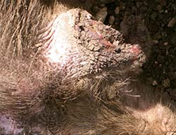 Sarna: grandes lesiones con costra especialmente en las orejas, provoca grandes pérdidas económicas, diagnosticado por raspadura de la piel pero de fácil tratamiento (avermectinas) aunque es preciso hacerlo de forma regular y por granjas. Hay muchas reacciones provocadas a menudo por reacciones de hipersensibilidad.