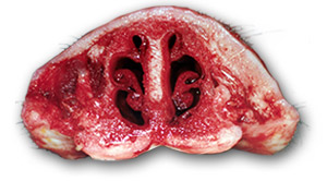 | 4- Sólo quedan algunas porciones de cornetes, la pérdida de tejido es ya muy importante. El septo nasal está muy deformado. | 5- No quedan restos de los cornetes, hay una completa atrofia del tejido. En este caso, sin embargo, el septo nasal sigue recto. |